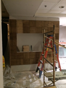 Commercial fabrication and installation - Vesta Coffee butcherblock countertops; and restaurant scrabble wall, shiplap wood and mirror wall and bar, and tabletops: